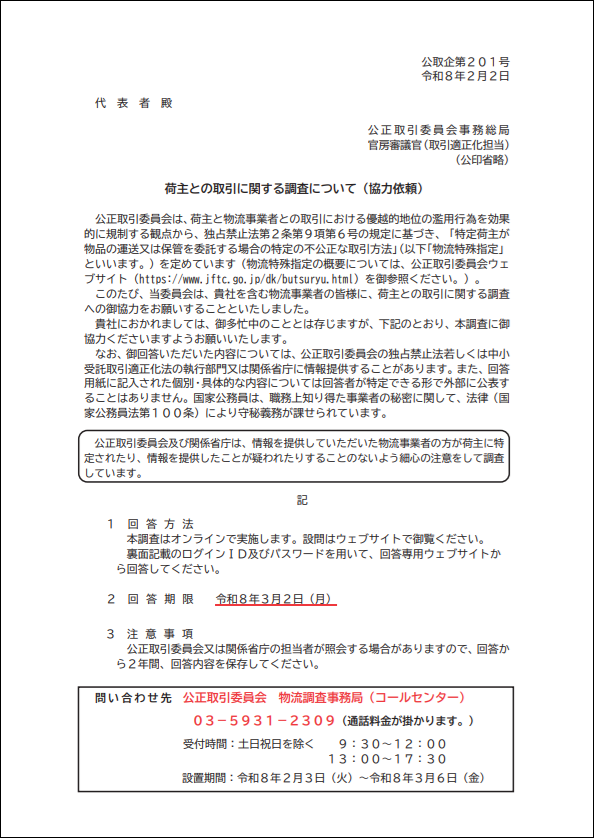 荷主との取引に関する調査について(協力依頼)(公正取引委員会)