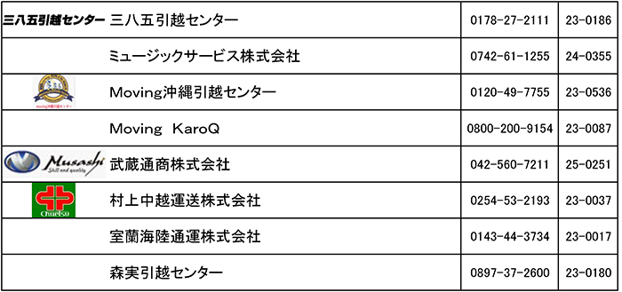 マイスター引越センター 前佐渡運送株式会社 まごころ引越便 株式会社益生小型運送 松浦通運株式会社 株式会社松下運輸 松下運輸株式会社 丸運十和田運送株式会社 丸運輸送株式会社 丸栄ニューウェーブ株式会社 マルエイ引越サービス マルケー萩貨物自動車株式会社 株式会社丸善運輸 丸全昭和運輸グループ(引越1番) 丸髙運送株式会社 マルナ引越センター マルハコーポレーション 有限会社まるひろ 株式会社丸や運送 丸和運輸株式会社 三河ひよっこ引越しセンター みすゞ運輸有限会社 株式会社都運送 三八五通運引越センター 三八五引越センター ミュージックサービス株式会社 Moving沖縄引越センター Moving KaroQ 武蔵通商株式会社 村上中越運送株式会社 室蘭海陸通運株式会社 森実引越センター