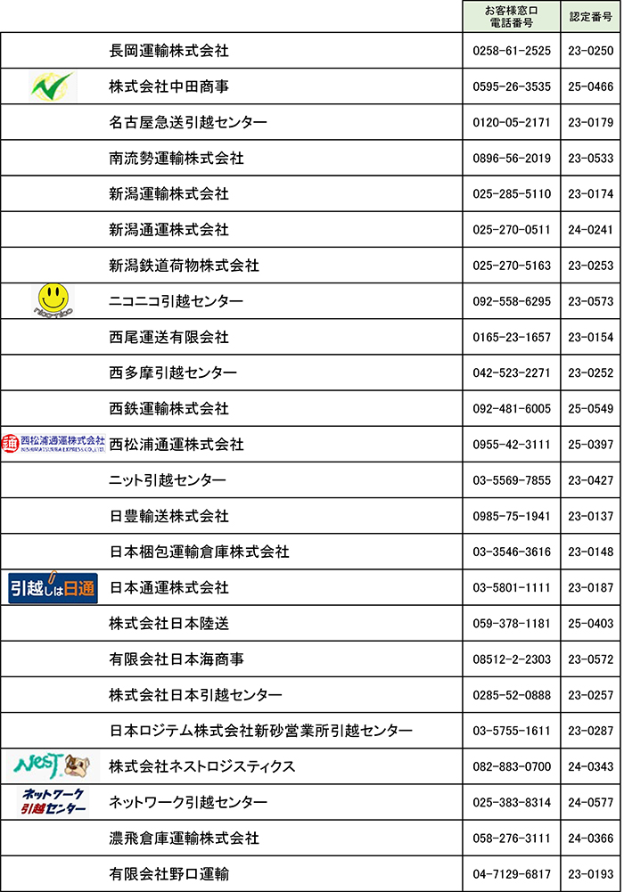 引越安心マーク制度 認定事業者一覧(な行)