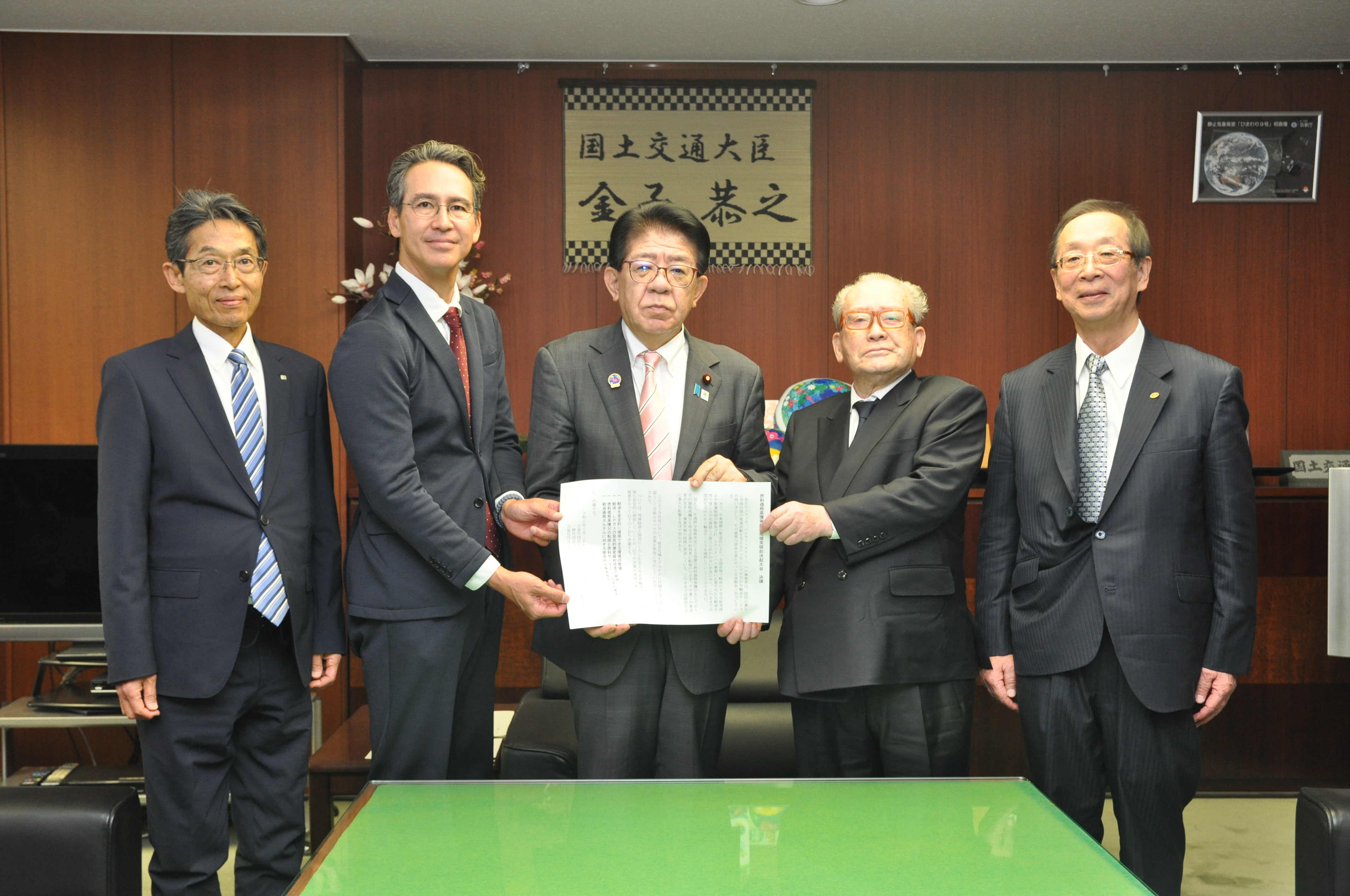 なお、大会終了後、トラック、バス、タクシーの3団体の代表が国土交通省を訪れ、金子恭之国土交通大臣に上記大会で採択した決議文を手交した。